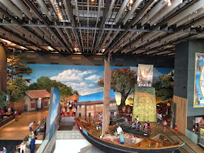 直接上二樓,從航海開始認識這塊土地,經過唐山過台灣,看到漢人跟原住民訂下地契、土地買賣的狀況;來到日本統治、白色恐怖、經濟起飛到現在,用栩栩如生的蠟像人物、建築生動的瞭解台灣歷史,而蠟像都以一比一的大小在眼前展示,那個虱目魚的場景,想起小時候在市場看到販賣虱目魚就是這樣一竉一竉的,排序方式也就是這樣。曾幾何時,現在看到都是切片的,也許要看到完整一條魚都變少了。會對這個特別記憶深刻該是小時候每天就是跟著奶奶上菜市場,也記得某位遠房親戚總是會到村子裡賣虱目魚,我們總是每天要去打招呼,而我覺得這樣的排序很美,所以看到那個圖像時,才想起那該是好久好久以前的時光了!
