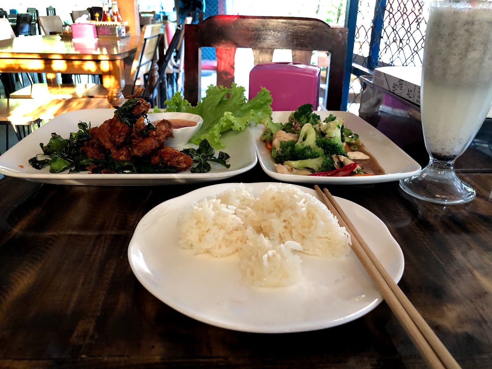 這種五點多太陽還很大,是個喝啤酒享受happy hour的時段,只是來到這裡就會想念火龍果檸檬汁,讓我捨棄喝啤酒換喝果汁,畢竟這還是比較少喝到的果汁,啤酒一路上每天都會喝。點餐又是另一個難題,一個人根本就是只能吃一份炒河粉OR咖哩麵OR炒飯而ˇ已啊!跟我大概同樣時間吃很早的晚餐的兩位西方人就只是點炒河粉,但我有點想念糯米飯,所以點了糯米飯,配個青菜,然後覺得下午小點該有個炸物,就這樣算是今天的午晚餐了。